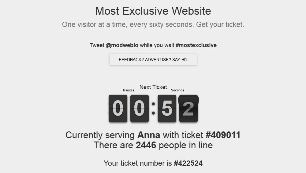 El sitio en cuestión se llama Mostexclusivewebsite.com y su nombre lo dice todo. Esta diseñado para que solo una persona pueda ver su contenido durante 60 segundos; el resto, debe entrar, poner su nombre y esperar en la fila.