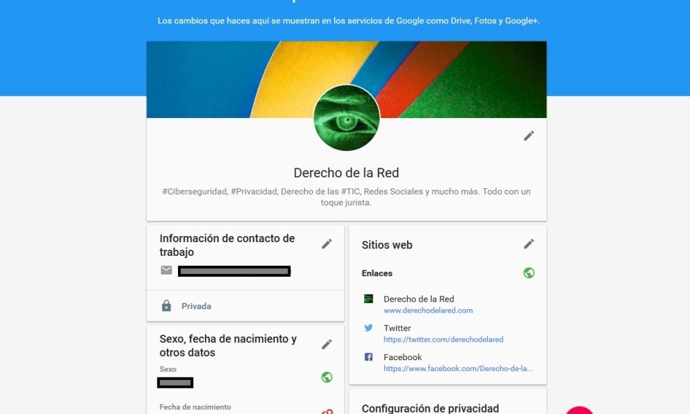 Todos los cambios que realices en esta sección afectarán a tu perfil de los diferentes servicios de Google tales como Gmail, Drive, YouTube, Photos…