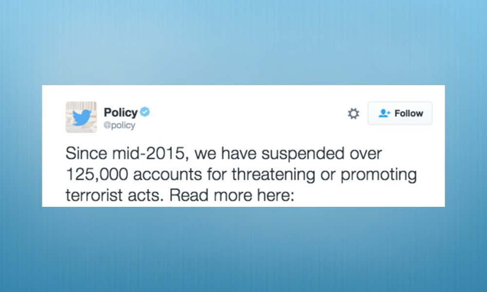 Twitter ha reconocido que desde mediados de 2015 ha suspendido más de 125.000 cuentas. La razón de estas suspensiones ha sido la violación de las reglas de la red social por enaltecimiento del terrorismo y por compartir contenido para la difusión del mismo.