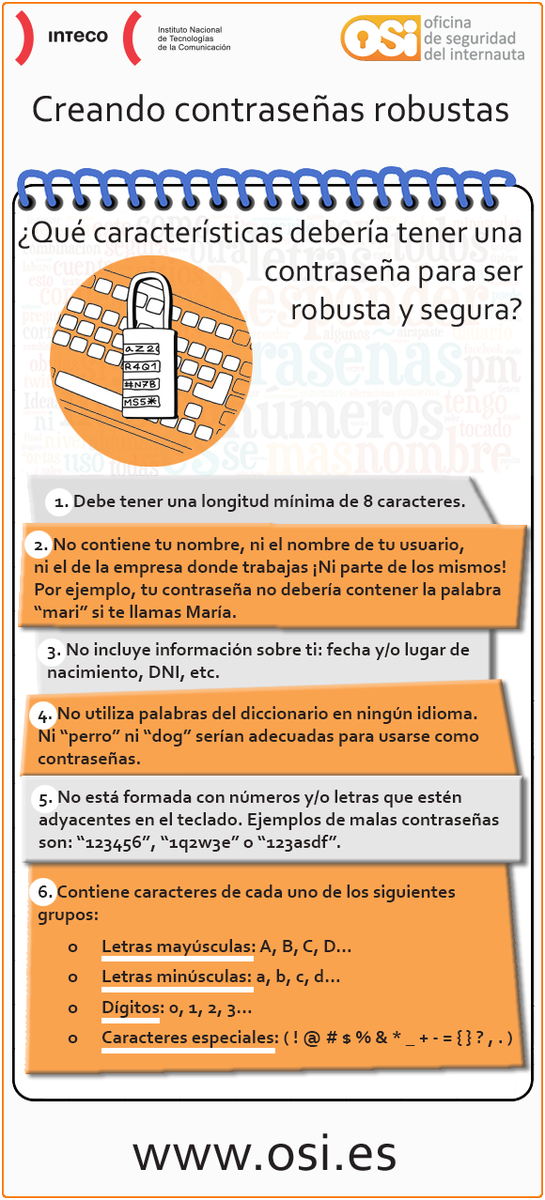 Mucha gente se ampara en el desconocimiento a la hora de crear contraseñas seguras y, por ello, desde la Oficina de Seguridad del Internauta (OSI) nos recogen en una infografía una serie de requisitos que debe seguir nuestra contraseña: