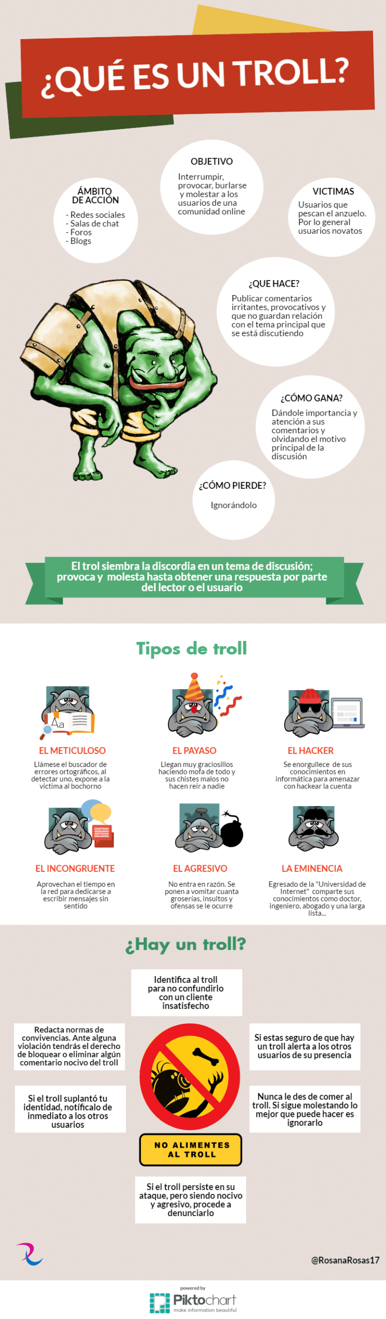 Cómo en todos los ecosistemas tiene una fauna propia que es exclusiva y que no se da en ninguno más. Hablamos de los Trolls, personas que publican mensajes provocadores, irrelevantes o que no tienen nada que ver con el tema que se está tratando en una comunidad en línea – foro de discusión, redes sociales o similares- con la intención de molestar y/o provocar una respuesta emocional negativa en los usuarios y lectores.