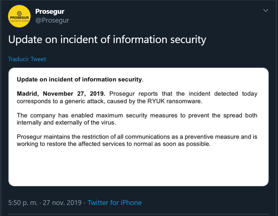 Uno de sus últimos ataques con éxito conocidos hasta la fecha ha sido el de Prosegur: