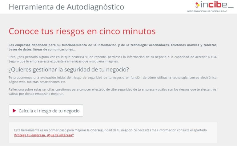 • El propio INCIBE (Instituto Nacional de Ciberseguridad de España, @INCIBE) que con una herramienta de «auto diagnóstico» (otro test) puede darte una idea del nivel de ciberriesgo que corre tu negocio o empresa.