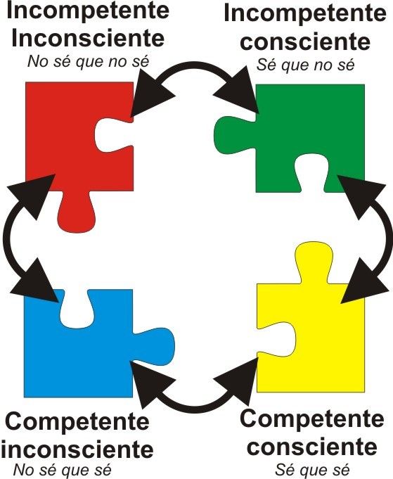 Unos se consiguen gracias a los otros, pero inicialmente debemos partir por lo más básico «ser conscientes«, «estar concienciados«, y, más concretamente «ser conscientes de que, al principio, seremos Inconscientemente Incompetentes«. Es decir darse cuenta de que no estamos lo suficientemente preparados y por lo tanto debemos aprender.