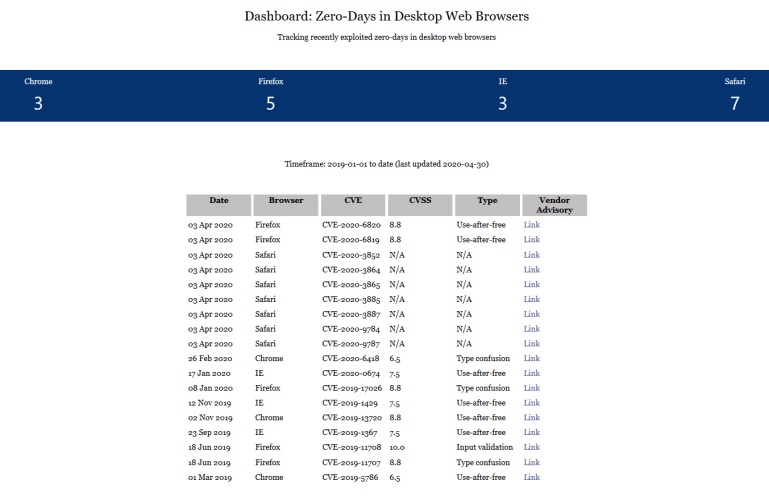 En la web podemos encontrar los 0-days que se han ido descubriendo para navegadores web actualizada cada 24/48 horas y con: