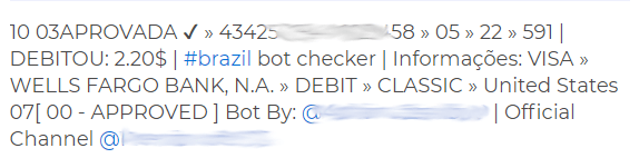 En esta captura de ejemplo podemos ver como salen los datos de una tarjeta bancaria completa, además se especifica que es funcional actualmente y que esta información proviene de un bot, del bot de nuestro famoso usuario.