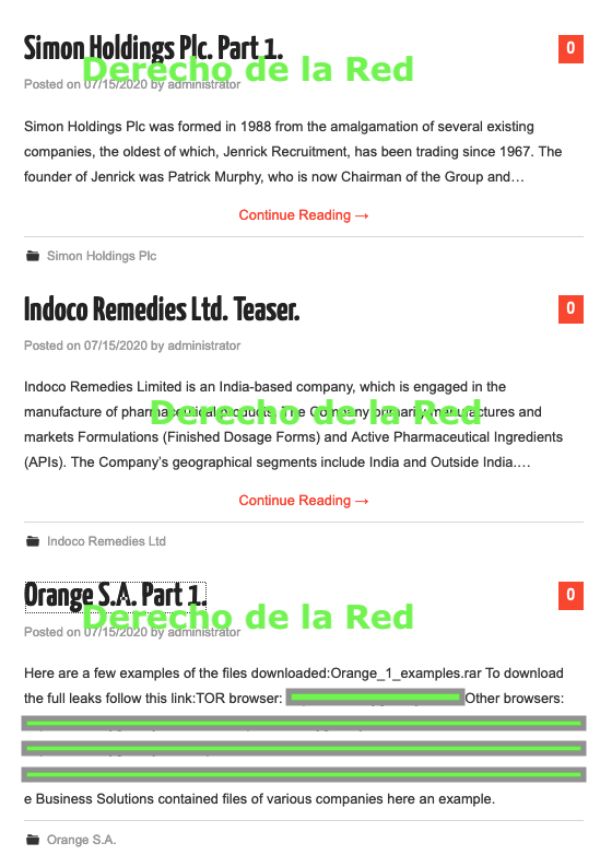 Ayer 15/07/2020, el actor que opera tras el servicio de Ransmoware «Nefilim» añadió tres víctimas nuevas a su lista. Entre estas se encontraba el operador de telefonía Orange S.A. Las otras dos entidades eran Indoco Remedies y Simon Holdings.