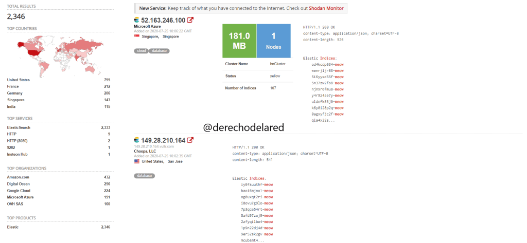 Hace dos días, alertábamos por nuestra cuenta de Twitter y nuestro canal de Telegram de que habíamos localizado un nuevo gusano, al que hemos bautizado como «Elasticworm«, que buscaba servidores abiertos de Elasticsearch y eliminaba los índices con datos, creando nuevos índices vacíos con un nombre aleatorio, al final de los cuales añade el sufico «-meow».