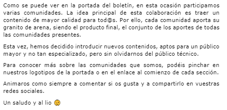 Una vez teníamos la plantilla, y contando con el apoyo de éstas comunidades, los redactores nos proporcionaron sus textos, cada comunidad se encarga de escribir una parte, si no pueden hacerlo durante un mes, simplemente ese mes no sacaremos nada con esa comunidad, pero seguiremos contando con su apoyo y sus logos, entendemos que el tiempo es algo que no nos sobra precisamente 😉 .