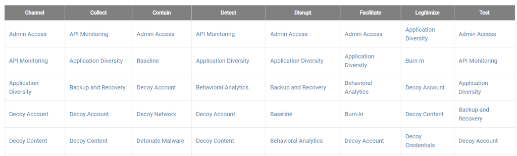 Shield de MITRE presenta información en un formato matricial, de manera similar a ATT & CK . La matriz consta de ocho columnas, cada una de las cuales enumera diferentes tácticas, como detectar, interrumpir, contener y recopilar, que los profesionales de la seguridad pueden usar para defenderse de los intrusos en la red. Los datos con hipervínculos en las filas o en cada una de las celdas describen las técnicas reales que los defensores pueden usar para implementar cada una de estas tácticas.