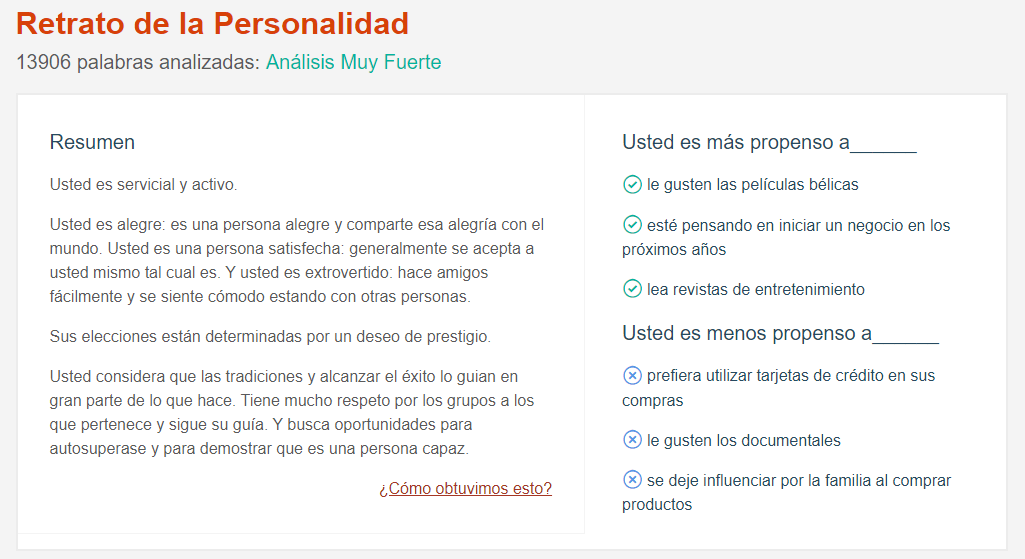 Se trata de Personality Insights, un servicio que aplica análisis lingüístico y teoría de la personalidad para inferir ciertos atributos a partir de texto desestructurado de la persona.