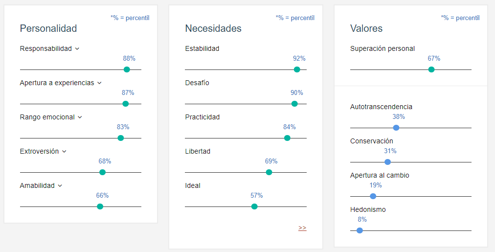 Además, podremos consultar unos percentiles que provienen de comparar a una persona con una población más amplia. Dicha población se basa en los usuarios del mismo lenguaje que hayan sido analizados por la herramienta. Por ejemplo, un 90% de Extroversión no significa que la persona es 90% extrovertida. Significa que para ese rasgo de la personalidad, la persona es más extrovertida que el 90% de las personas en esa población.