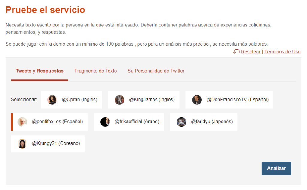 *Nota: Para analizar la personalidad del perfil de Twitter requerimos de la autorización en la red social, por tanto, no podemos analizar perfiles que no sean nuestros.