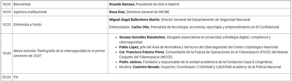 Este año 2020, debido al COVID19, 100% online, extendiéndose durante todos los jueves de octubre (de 18:00 a 20:00, hora española), focalizándose en el framework NIST CFS y, tratando cada uno de los cinco pilares que lo sustentan, en cada una de estas jornadas.