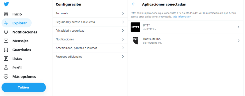 Para revocarle los permisos, deberemos dirigirnos a nuestra cuenta de Twitter, «Más opciones» > «Seguridad y acceso a la cuenta» > «Aplicaciones y sesiones» > «Aplicaciones conectadas» y en ese punto seleccionamos la aplicación y hacemos clic en «Revocar acceso»