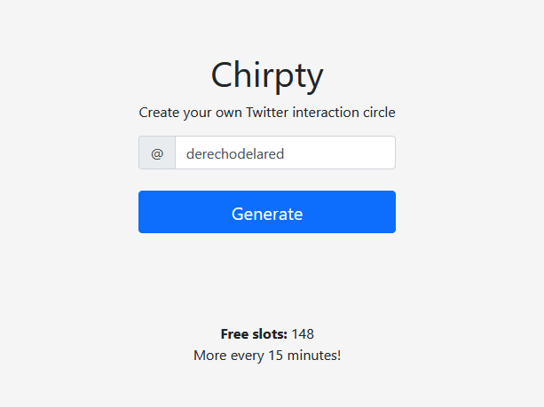La parte mala es que dispone de un número determinado de slots que se renuevan cada 15 minutos, ya que la API de Twitter permite que Chirpty solo realice una cierta cantidad de solicitudes cada 15 minutos, por lo que tendremos que tener paciencia para conseguirlo.