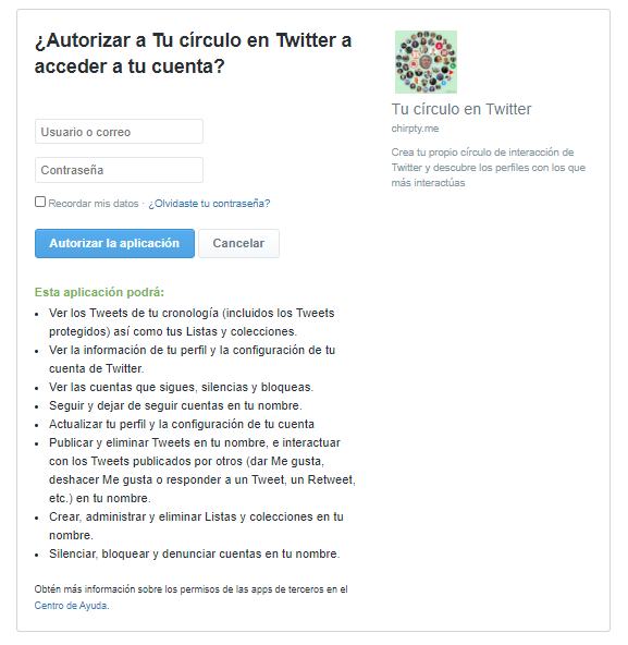 En ese momento, deberemos autorizar a la aplicación a que tenga acceso a nuestra cuenta de Twitter, concediéndole los siguientes permisos: