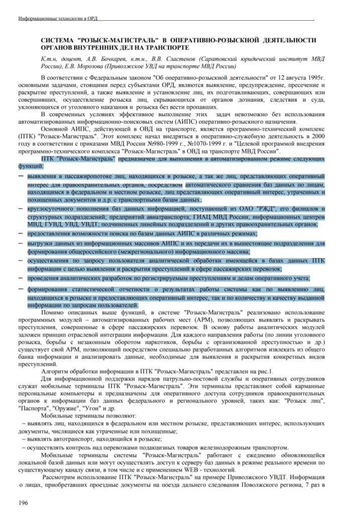 Este programa según hemos estado investigando comenzó sobre el año 2000 en las órdenes del Ministerio del Interior de Rusia No. 980-1999, No. 1070-1999 y el «Programa de implementación de objetivos Complejo de software y hardware «Búsqueda-Magistral» en el Departamento de Asuntos Internos sobre el transporte del Ministerio del Interior de Rusia.