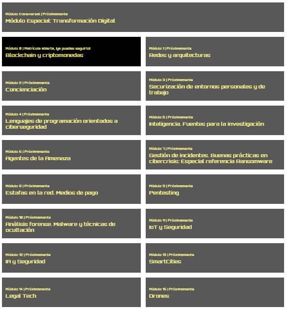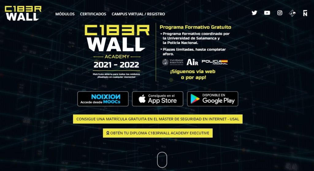 - C1b3rWall Academy 2021: actualmente en curso hasta el 15 de Julio con su primer módulo sobre Blockchain y Criptomonedas, pero que se reanudará en Septiembre con los siguientes 15 nuevos y muy interesantes módulos, durante todo el año:https://c1b3rwallacademy.usal.es/