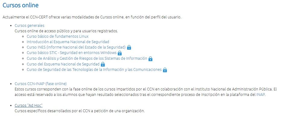 - Otros cursos online (generalmente en cerrado para Administraciones Públicas y Empresas): www.ccn.cni.es/index.php/es/menu-formacion-es