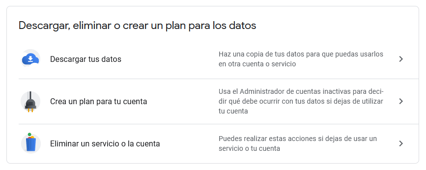 En esa pestaña, dónde podemos elegir que pasa con nuestros datos, aunque ya sabemos que estamos en Google, debemos dirigirnos a la parte de «Descargar, eliminar o crear un plan para los datos«