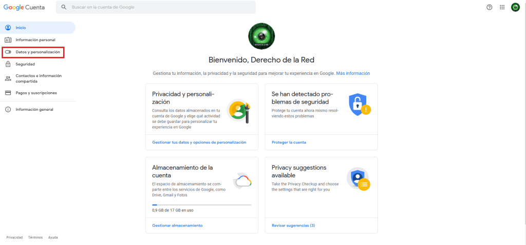 Para comenzar, debemos dirigirnos a nuestra cuenta de Google https://myaccount.google.com/ y una vez que introduzcamos nuestro usuario y contraseña, hacer click en el lateral izquierdo en «Datos y personalización«