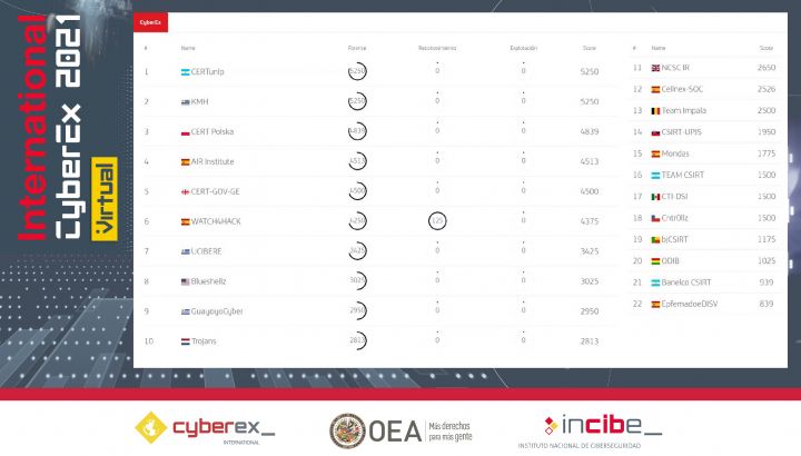 El equipo argentino CERTunlp, de la Universidad Nacional de La Plata, se ha proclamado ganador de la séptima edición de los International CyberEx 2021, con 5.250 puntos. CERTunlp consiguió resolver 8 de los 12 retos totales del ejercicio en formato CTF (Capture The Flag), consistentes en ingeniería inversa, forense, criptografía y pentesting. En segundo lugar quedó KMH, el equipo uruguayo, con 5.250 puntos; en tercer lugar el CERT Polska, de Polonia, con 4.839 puntos; y en cuarto lugar con 4.513 puntos, el equipo español, AIR Institute.