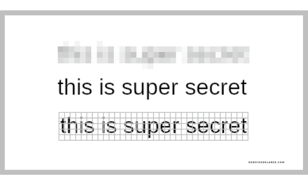 Realmente, la forma infalible (de momento) de eliminar información de un texto es mediante la inserción de barras negras en el mismo que tapen toda la información que queremos ocultar. Pero hay veces que se pixelan los textos y/o se difuminan pensando que se tiene el mismo nivel de seguridad, y no.