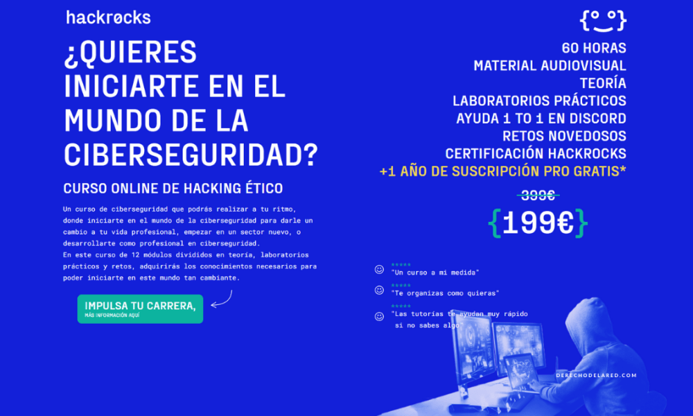 El curso tiene un precio especial de 199€ (antes eran 399€) pero hemos conseguido que la gente de Hackrocks nos de el código DerechoDeLaRed25 con un 25 % de descuento para toda la plataforma, por lo que se os queda por menos de 150€.