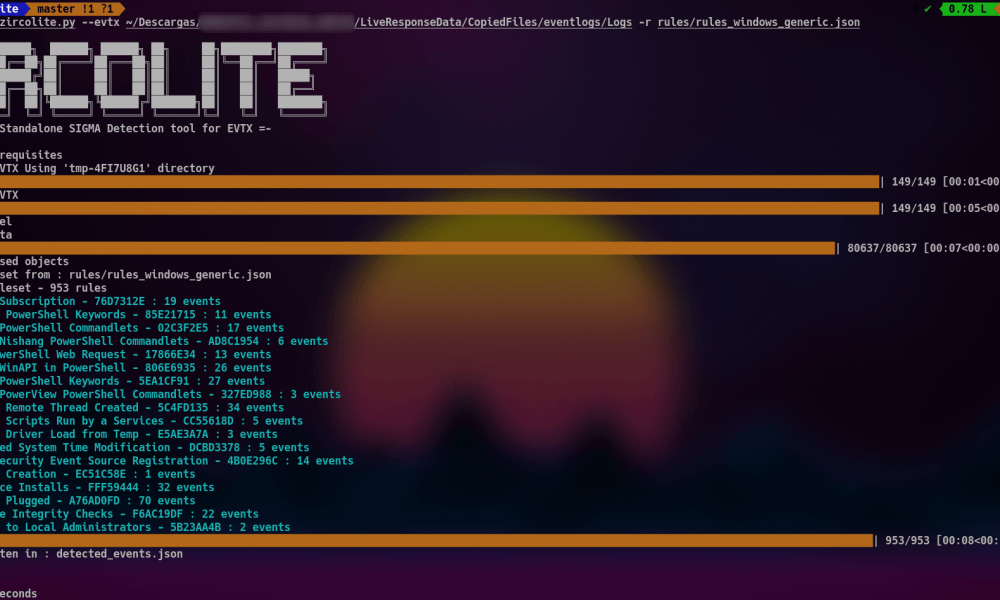 Esta nueva herramienta, que tiene muy poco tiempo de vida (Abril de 2021), se llama Zircolite. Esta está desarrollada en python3, y permite ejecutar reglas Sigma de manera muy rápida en los ficheros de log con formato EVTX.