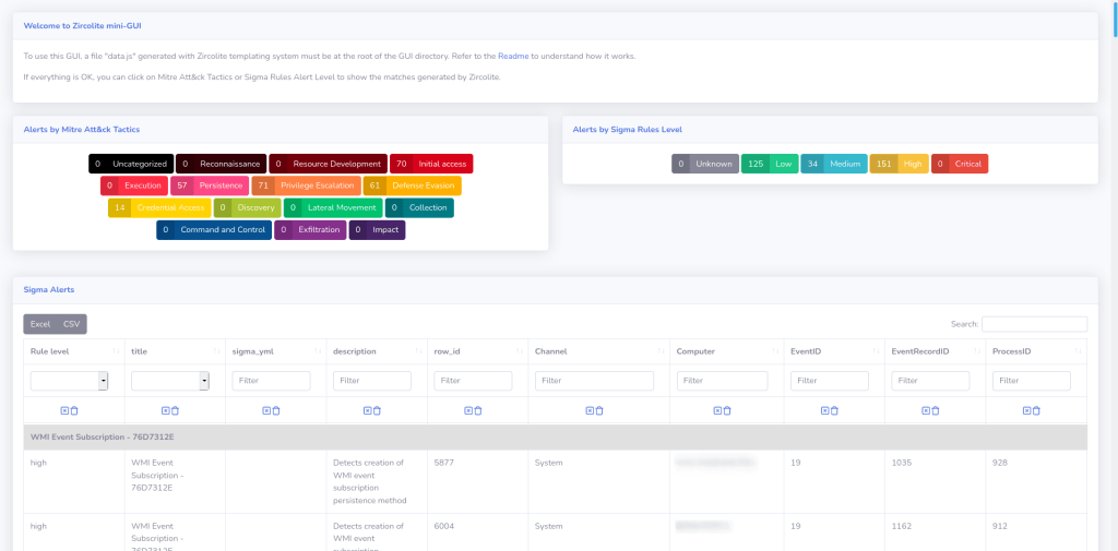 Como se puede apreciar, la web es capaz de clasificar los resultados por las técnicas de Mitre ATT&CK o por el nivel de criticidad de las reglas Sigma. Tras seleccionar cualquiera de estos filtros, se genera una tabla con los resultados que cumplen con la característica indicada.
