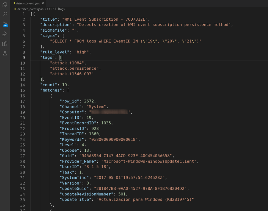 Como se puede ver en la anterior imagen, solo ha tardado 23 segundos en analizar 149 ficheros de log. Entre ellos se encuentran los logs de Sysmon y los del sistema operativo Windows. Como se puede observar, devuelve un fichero JSON denominado detected_events.json, en el cual se encuentran los registros que han coincidido con las reglas Sigma utilizadas. En la imagen podemos ver qué reglas Sigma han dado resultados y la cantidad de registros que han detectado cada una de ellas. El aspecto del fichero JSON es el siguiente: