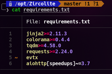 Cuando este finalice, tendremos una nueva carpeta en el directorio denominada Zircolite. Accedemos a ella haciendo uso de nuestra terminal. Al hacerlo, si lanzamos el comando ls, veremos que existe un fichero denominado requirements.txt. Debemos abrir este fichero y editarlo, de forma que quede como se ve en la siguiente imagen. Esto es así porque si no se genera un error al instalar la librería evtx: