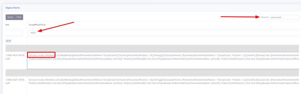 Por ejemplo, por ver un poco el funcionamiento de la web, podemos seleccionar las alertas de criticidad alta, filtrar por la palabra powershell y si fuera necesario, filtrar los resultados de la columna que nos interese: