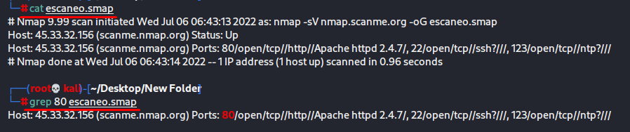 Podemos acceder al contenido del fichero de salida y a continuación le pasamos el comando grep con la opción 80 para que nos devuelva la línea del puerto 80 escaneado anteriormente: