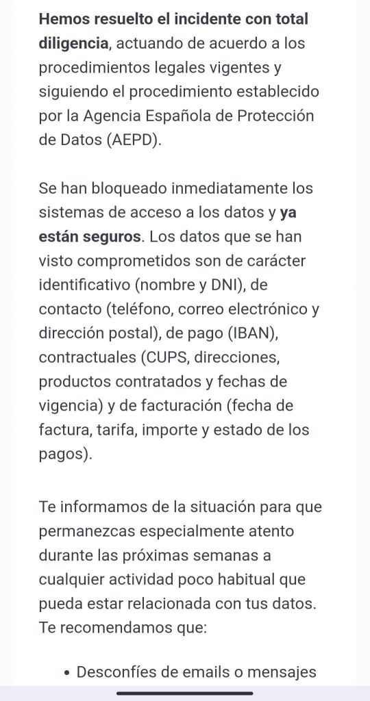 La empresa ha asegurado que el incidente «se ha resuelto de forma inmediata» y que ha actuado de acuerdo con los procedimientos legales vigentes y siguiendo el procedimiento establecido por Agencia Española de Protección de Datos (AEPD).