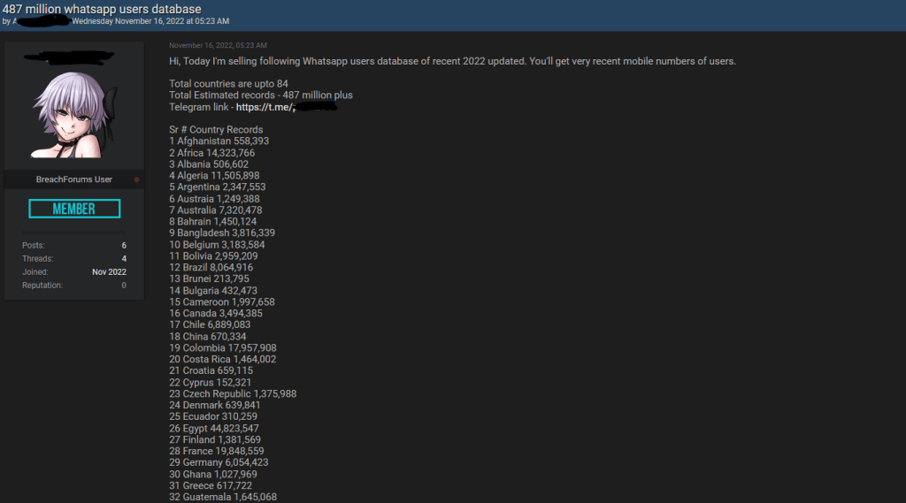 El pasado 16 de noviembre, un usuario de un conocido foro (Breached) publicó un anuncio de venta de una base de datos en el que afirmaba que vendía una base de datos de 2022 con 487 millones de números de móvil de usuarios de WhatsApp.