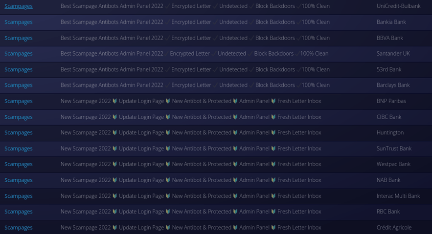 Son kits preparados para suplantar diversas entidades financieras de múltiples países. La divisa para comprar estos kits es el $. Para los kits mostrados en la imagen anterior el precio varía entre los 15 – 20 $.