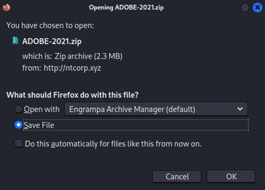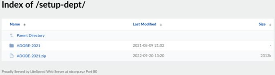 Solo obtuvimos una URL que nos devolviera resultado anteriormente. La URL es hxxp://ntcorp.xyz/setup-dept/ADOBE-2021.zip. Descargamos este archivo ZIP para investigar su contenido. Puede ser un kit de Phishing, que nos puede aportar gran cantidad de información.