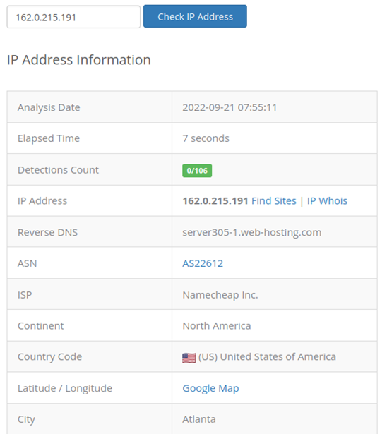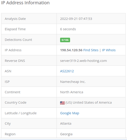 No aporta gran información más allá del hosting y una dirección IP. El siguiente paso es verificar la reputación de este dominio y su IP. Utilizaremos diversas herramientas como VirusTotal, urlscan.io e IPVoid