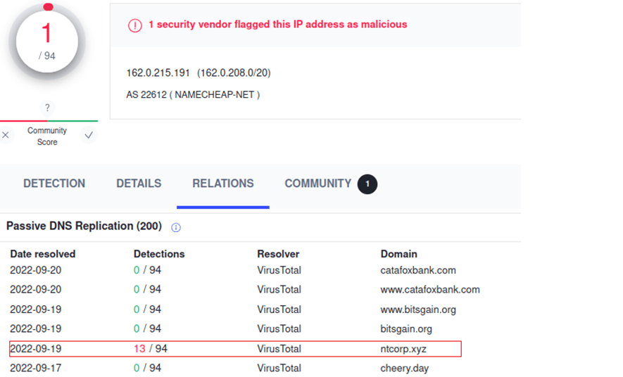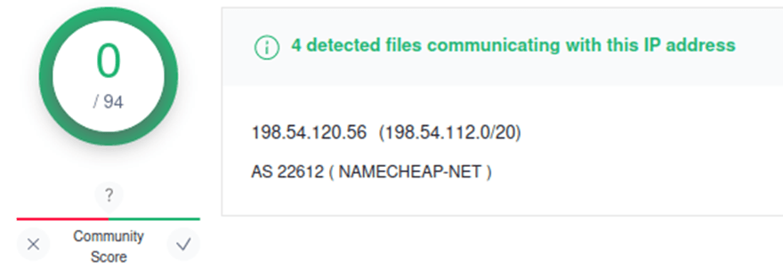 Tenemos dos resultados interesantes que no habíamos obtenido hasta el momento, Google detecta el dominio como malicioso y tenemos otra dirección. Vamos a volver a buscar la nueva IP en VirusTotal.