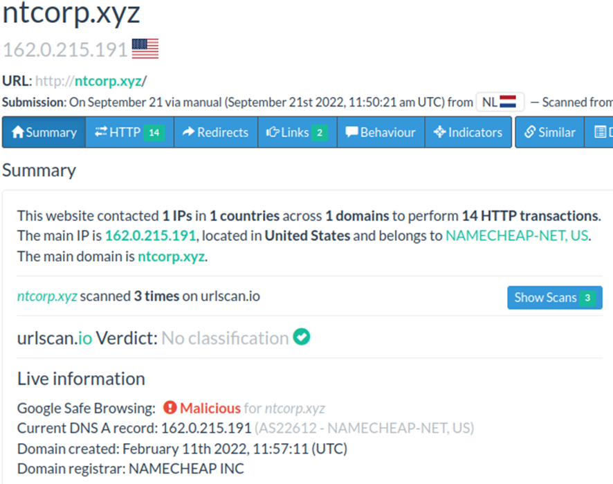 Hemos recibido la siguiente URL maliciosa hxxp://ntcorp.xyz/. Durante la investigación utilizaremos diversas herramientas y técnicas con la que intentaremos extraer toda la información posible.