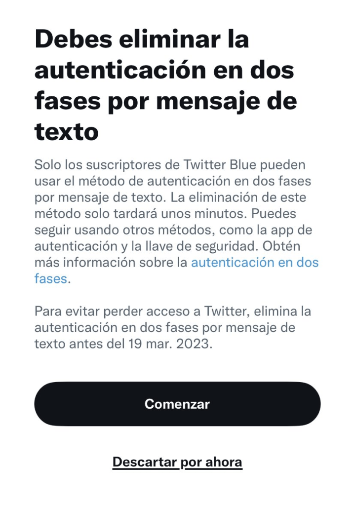 Los usuarios de Twitter no suscritos a Blue que se hayan inscrito en el método 2FA basado en SMS tienen tiempo hasta el 19 de marzo de 2023 para cambiar a un método alternativo, como una app autenticadora o una llave de seguridad de hardware. Después de esta fecha límite, se desactivará la opción para los usuarios no suscritos a Twitter Blue.
