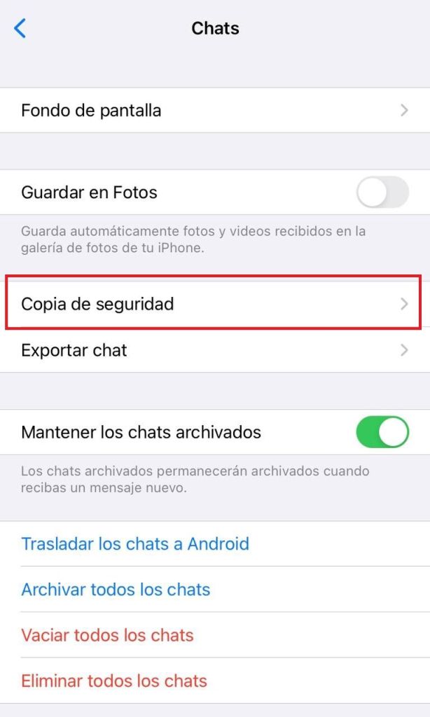 - Selecciona «Chats» y luego «Copia de seguridad«.