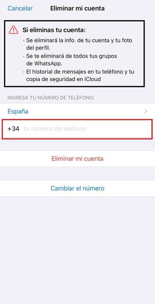 - Ingresa tu número de teléfono en el formato internacional y presiona «Eliminar mi cuenta».