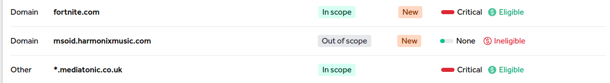- Scope: Activos en los cuales se podrá investigar en búsqueda de vulnerabilidades(In Scope). También se puede excluir algún activo en concreto (Out of Scope). Solo serán validos los reportes que sean sobre activos dentro del Scope.