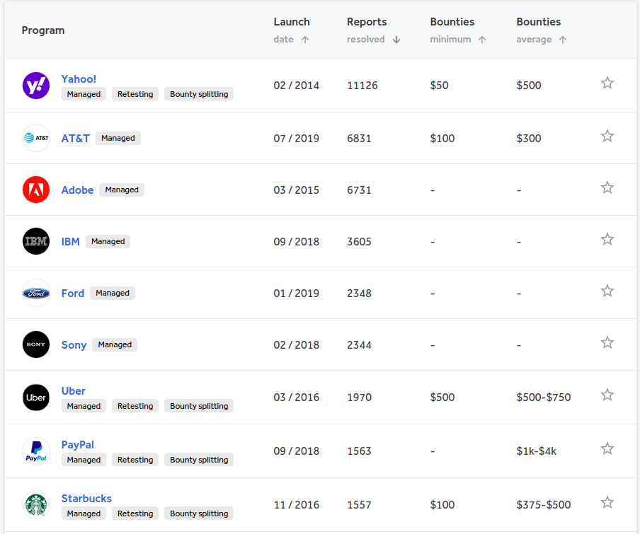 - Plataforma: Son entornos que albergan varios programas de diferentes organizaciones. Estos programas aparecen organizados en un directorio(Solo los públicos), acompañados de estadísticas y características del programa. Las plataformas sirven de intermediarias entre el hacker y el equipo de seguridad, facilitando tareas como la comunicación y el pago de la recompensa. Estos entornos, además, usan la gamificación para hacer más atractivo el proceso y que haya competencia, fomentando, por supuesto, la creación de una comunidad. Por último, también son unas fuentes de consulta de información muy interesante, ya que en las plataformas se podrán encontrar write-ups, artículos, tutoriales, etc.