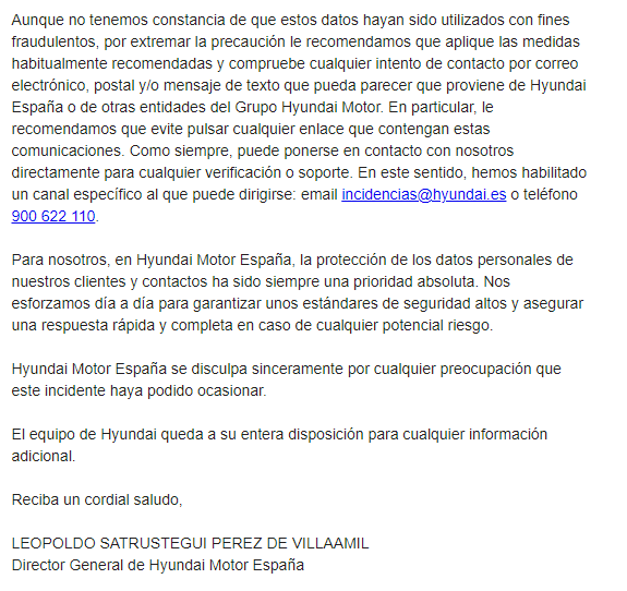 «Nuestra investigación informática indica que pueden haberse visto afectados algunos datos relativos a clientes y potenciales clientes. Los datos incluyen detalles de contacto (como correos electrónicos, direcciones y números de teléfono) y datos de vehículos (como números de bastidor) de nuestros clientes. No se han visto afectados datos financieros ni números de identificación oficial (como el DNI) de nuestros clientes», explica Hyundai en su comunicado enviado a sus clientes
