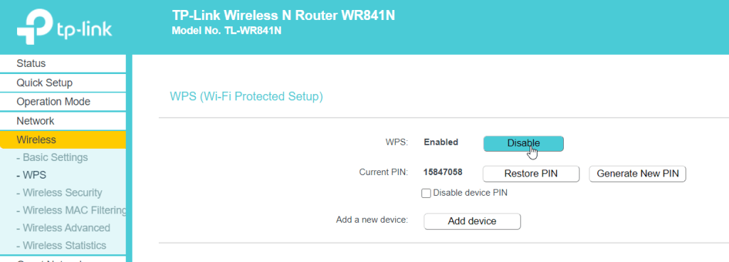 Por tanto, siempre y cuando nuestro router tenga esta opción, lo más seguro será desactivarlo. En nuestro caso sobre el apartado «Wireless» tenemos el subapartado «WPS». Accedemos al mismo y desactivamos: