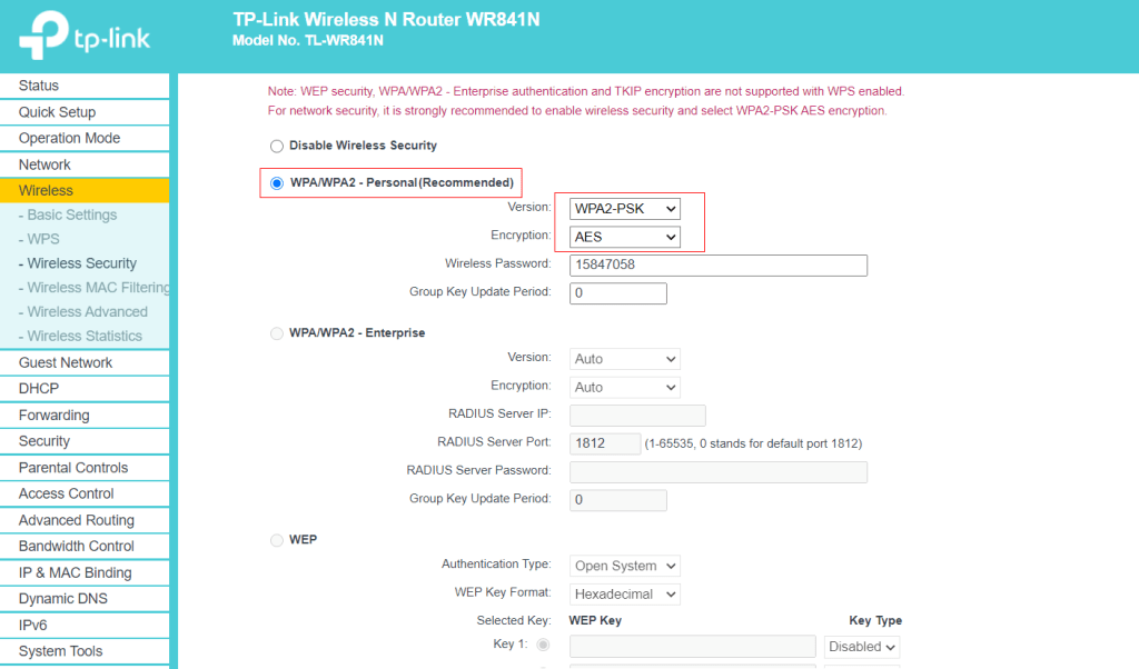 Es muy importante el uso del cifrado WPA2, ya que esto pondrá las cosas más difíciles a que puedan obtener nuestra contraseña de acceso. Para ello, marcamos su uso. Además, se realizará la elección del encriptado «AES» por tratarse de una encriptación más robusta: